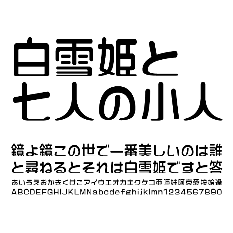お姫様のように愛らしく、小人のようにコロコロ。親近感のあるデザイン書体です。制作コンセプトは“胴長短足”。横線の太さを上から下へ徐々に細くすることで、文字の上部はタテに長く、下部は短くつまった独特のフォルムを実現。可読性を損なうことなく、遊び心に溢れる楽しい表現を可能にします。