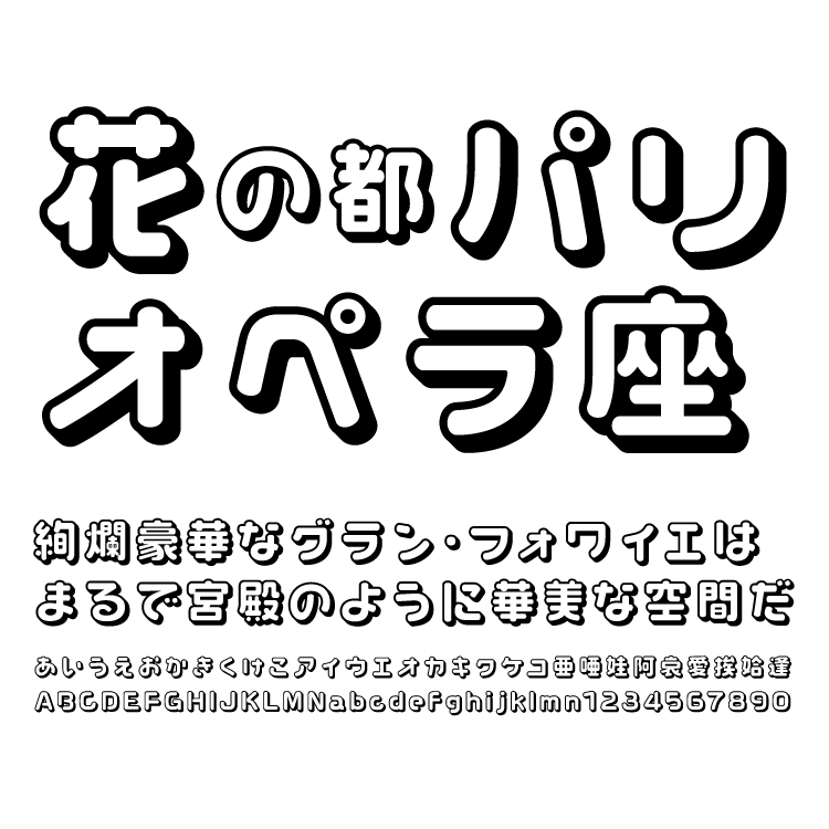 「メガ丸-pop」は、「メガ丸」のデザインをベースに生まれた装飾書体です。文字の輪郭線のみを強調したデザインの「メガ丸-pop-FutoLine」と、文字の背後に影を落とし立体的なデザインに見せる効果を持つ「メガ丸-pop-Shadow」があります。日本語フォントとしては数少ない装飾書体で、文字数も9,354文字と充実。実用性も十分です。(Adobe-japan 1-3準拠)