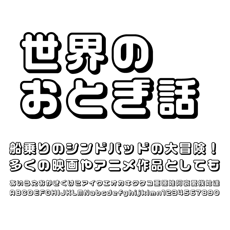 「ロゴ丸Jr-pop」は、「ロゴ丸Jr」のデザインをベースに生まれた装飾書体です。文字の輪郭線のみを強調したデザインの「ロゴ丸Jr-pop-FutoLine」と、文字の背後に影を落とし立体的なデザインに見せる効果を持つ「ロゴ丸Jr-pop-Shadow」があります。日本語フォントとしては数少ない装飾書体で、文字数も9,354文字と充実。実用性も十分です。(Adobe-japan 1-3準拠)